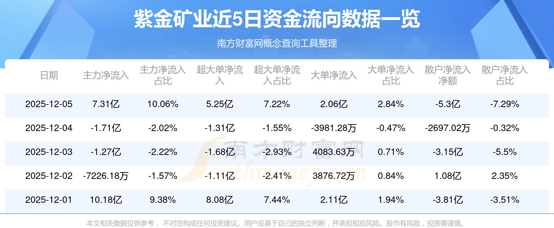12月5日消息,紫金礦業(yè)資金凈流入7.31億元,超大單資金凈流入5.25億元,換手率1.13%,成交金額72.67億元。