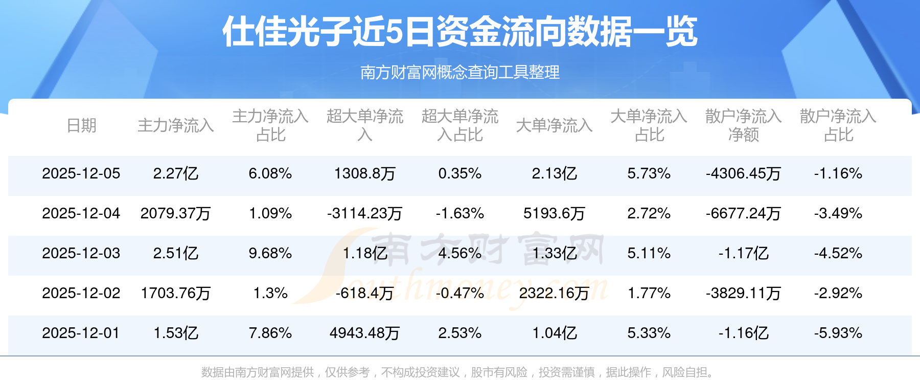 12月5日消息,仕佳光子資金凈流入2.27億元,超大單資金凈流入1308.8萬元,換手率9.45%,成交金額37.23億元。