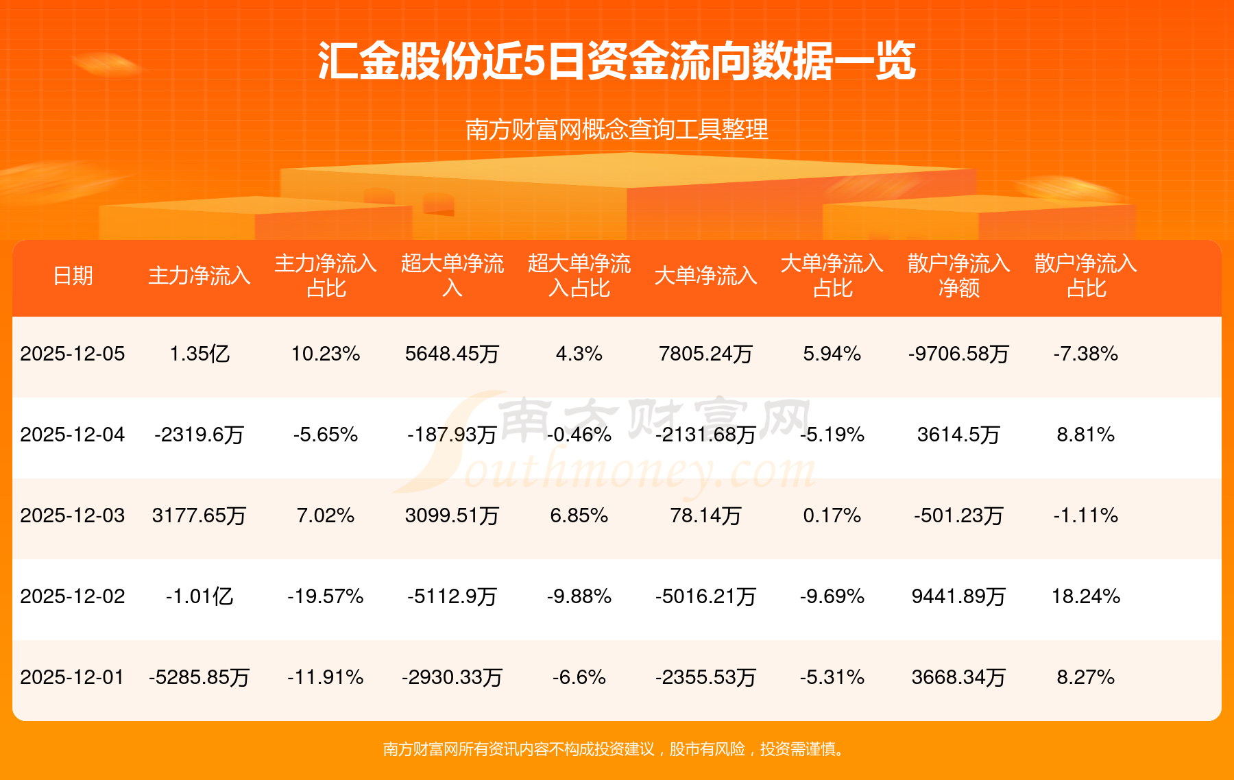 12月5日消息,匯金股份資金凈流入1.35億元,超大單資金凈流入5648.45萬元,換手率16.29%,成交金額13.15億元。