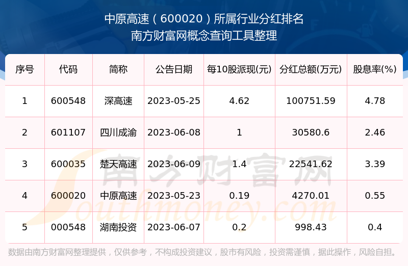 按照南方財富網(wǎng)趨勢選股系統(tǒng)統(tǒng)計,中原高速所屬行業(yè)為鐵路公路行業(yè),鐵路公路行業(yè)分紅排名情況如下表: