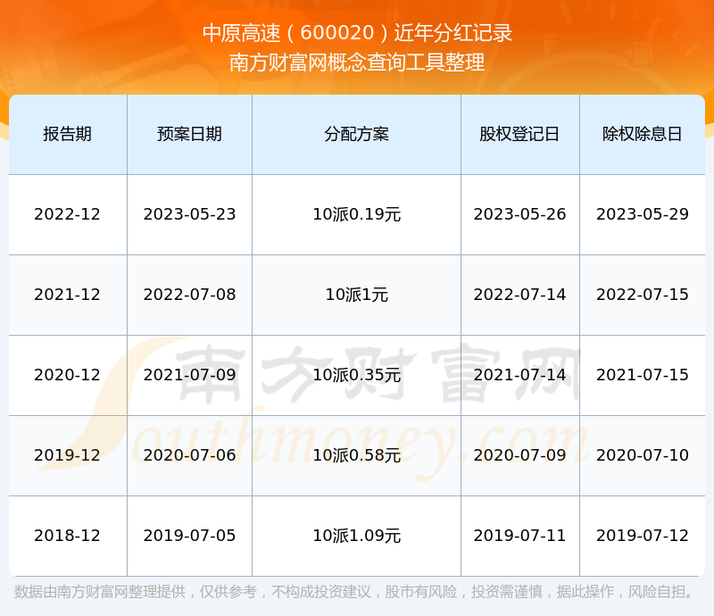 中原高速最新一次公布的分紅方案為10派0.19元。本次權(quán)益分派股權(quán)登記日為2023年5月26日,除權(quán)除息日為2023年5月29日,派息日為2023年5月29日。