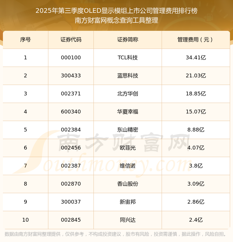 2025年第三季度,OLED顯示模組上市公司管理費(fèi)用排名如下:TCL科技(000100)的管理費(fèi)用總額高達(dá)34.41億,藍(lán)思科技(300433)和北方華創(chuàng)(002371)位居第二和第三,華夏幸福(600340)、東山精密(002384)、歐菲光(002456)、維信諾(002387)、香山股份(002870)、新宙邦(300037)、同興達(dá)(002845)分別進(jìn)入前十,其管理費(fèi)用總額分別排名第4-10名。