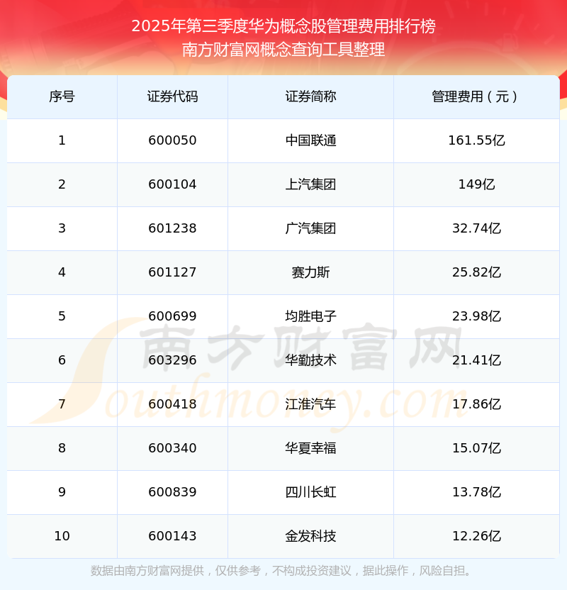 2025年第三季度,華為概念股管理費(fèi)用排名中,中國(guó)聯(lián)通(600050)的管理費(fèi)用總額高達(dá)161.55億,上汽集團(tuán)(600104)和廣汽集團(tuán)(601238)排名第二和第三,賽力斯(601127)、均勝電子(600699)、華勤技術(shù)(603296)、江淮汽車(chē)(600418)、華夏幸福(600340)、四川長(zhǎng)虹(600839)、金發(fā)科技(600143)進(jìn)入前十,其管理費(fèi)用總額分別排名第4-10名。