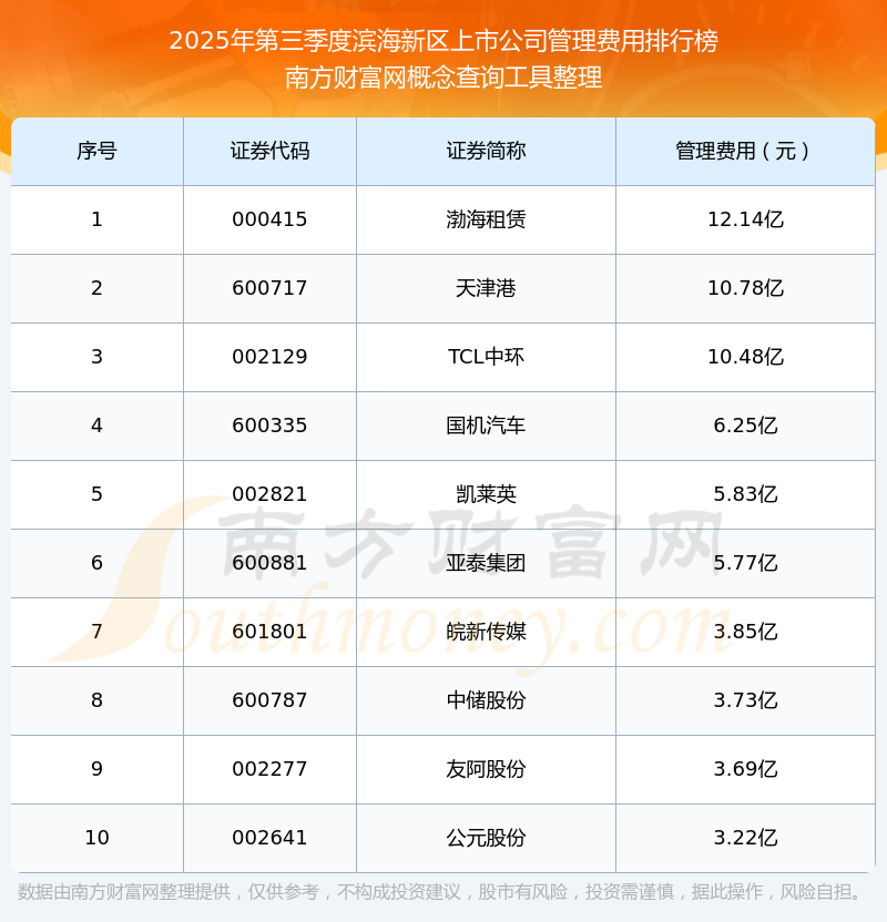 2025年第三季度,濱海新區(qū)上市公司管理費(fèi)用排名中,渤海租賃(000415)的管理費(fèi)用總額高達(dá)12.14億,天津港(600717)和TCL中環(huán)(002129)排名第二和第三,國機(jī)汽車(600335)、凱萊英(002821)、亞泰集團(tuán)(600881)、皖新傳媒(601801)、中儲(chǔ)股份(600787)、友阿股份(002277)、公元股份(002641)進(jìn)入前十,其管理費(fèi)用總額分別排名第4-10名。