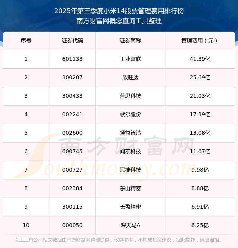 2025年第三季度,小米14股票管理費(fèi)用排行榜如下:工業(yè)富聯(lián)(601138)的管理費(fèi)用總額高達(dá)41.39億,欣旺達(dá)(300207)和藍(lán)思科技(300433)分別排名第二和第三,歌爾股份(002241)、領(lǐng)益智造(002600)、聞泰科技(600745)、冠捷科技(000727)、東山精密(002384)、長(zhǎng)盈精密(300115)、深天馬A(000050)分別進(jìn)入前十,其管理費(fèi)用總額分別排名第4-10名。