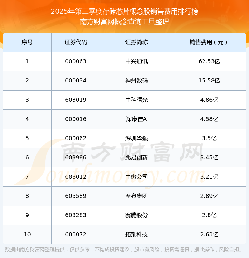 2025年第三季度,存儲(chǔ)芯片概念股銷售費(fèi)用排行榜如下:中興通訊(000063)的銷售費(fèi)用總額高達(dá)62.53億,神州數(shù)碼(000034)和中科曙光(603019)分別位居第二和第三,深康佳A(000016)、深圳華強(qiáng)(000062)、兆易創(chuàng)新(603986)、中微公司(688012)、圣泉集團(tuán)(605589)、賽騰股份(603283)、拓荊科技(688072)分別進(jìn)入前十,其銷售費(fèi)用總額分別排名第4-10名。