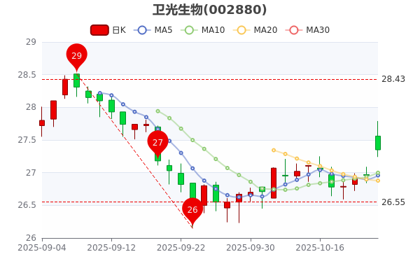 10月23日衛(wèi)光生物開(kāi)盤(pán)報(bào)價(jià)27.56元,收盤(pán)于27.350元,漲1.67%。當(dāng)日最高價(jià)為27.79元,最低達(dá)27.24元,成交量253.24萬(wàn)手,總市值為62.03億元。