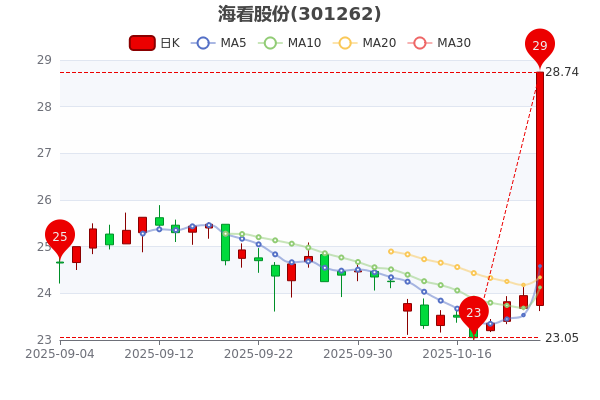 10月23日消息,?垂煞(301262)開盤報23.74元,截至下午三點收盤,該股漲20%報28.740元,換手率30.06% ,成交額10.3億元。