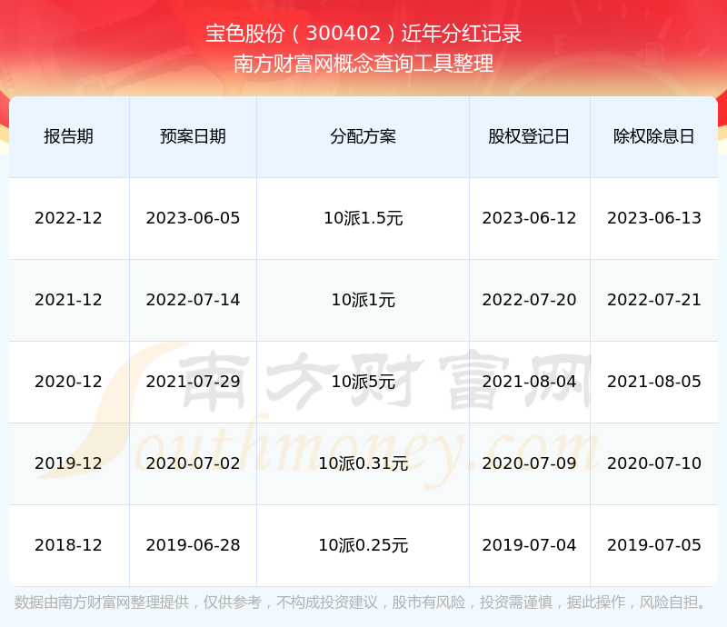 寶色股份最新一次公布的分紅方案為10派1.5元。本次權(quán)益分派股權(quán)登記日為2023年6月12日,除權(quán)除息日為2023年6月13日,派息日為2023年6月13日。