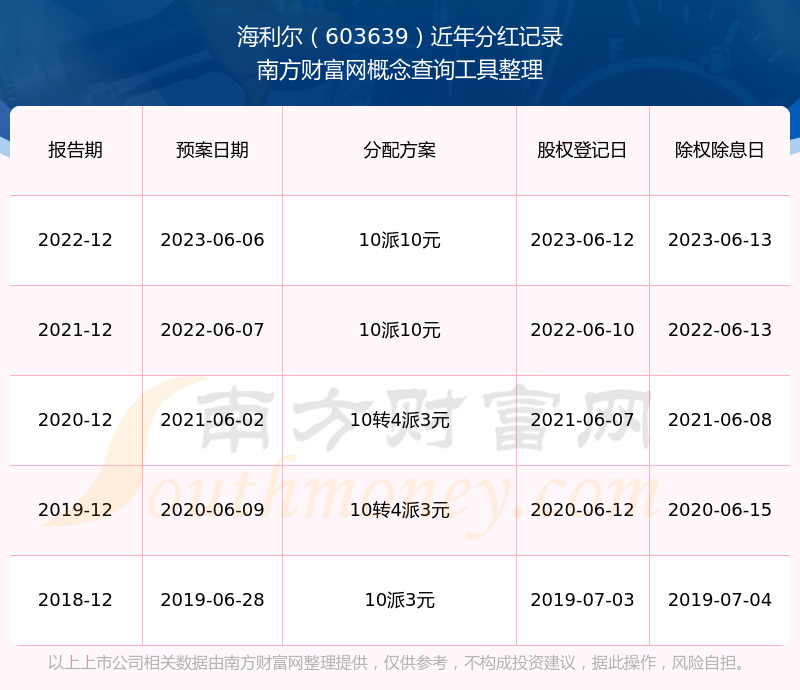 海利爾最新一次公布的分紅方案為10派10元。本次權(quán)益分派股權(quán)登記日為2023年6月12日,除權(quán)除息日為2023年6月13日,派息日為2023年6月13日。