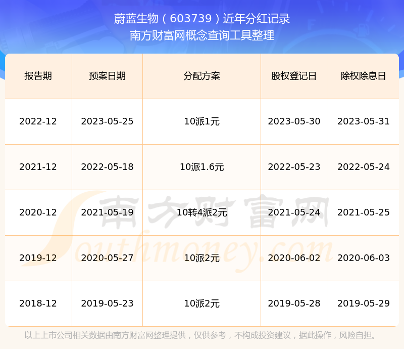 蔚藍(lán)生物最新一次公布的分紅方案:10派1元。