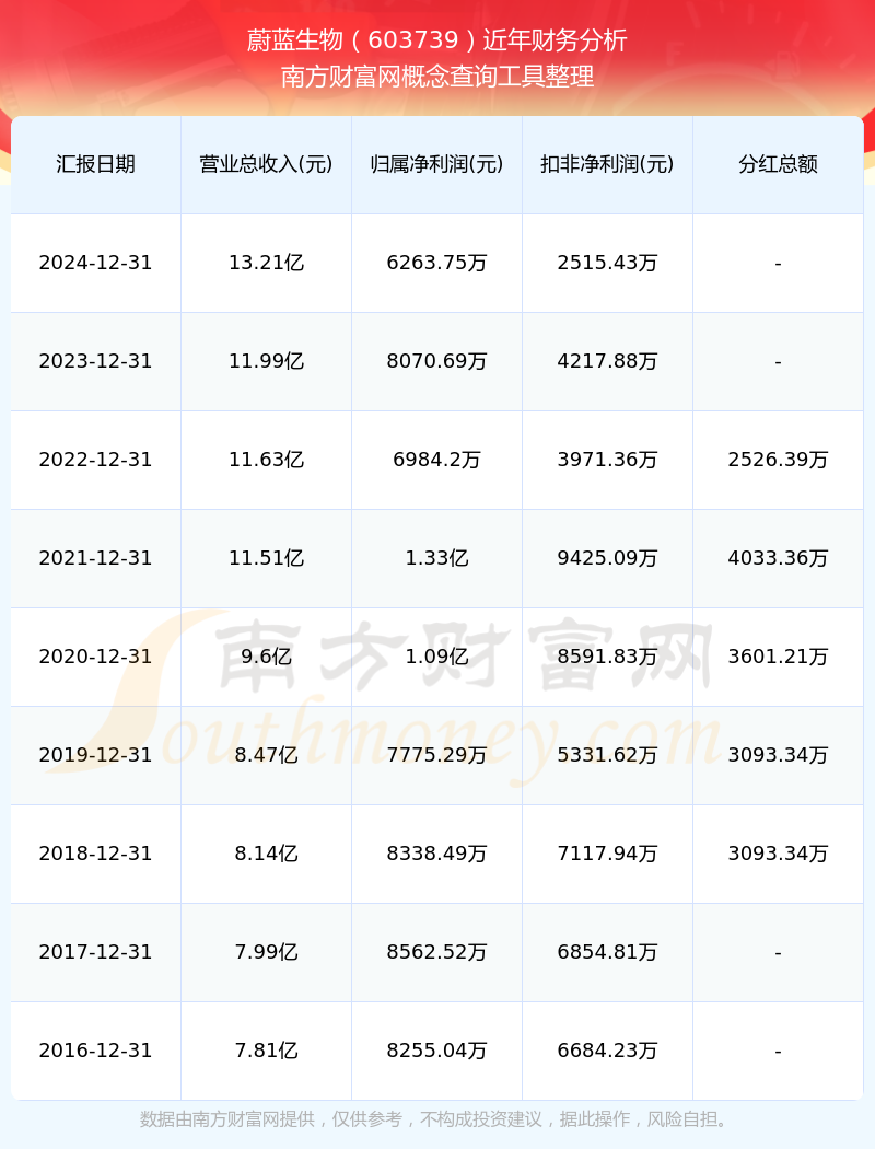 2024年報(bào)顯示,蔚藍(lán)生物實(shí)現(xiàn)營收13.21億,同比增長10.16%;凈利潤6263.75萬,同比增長-22.39%;毛利率45.05%。