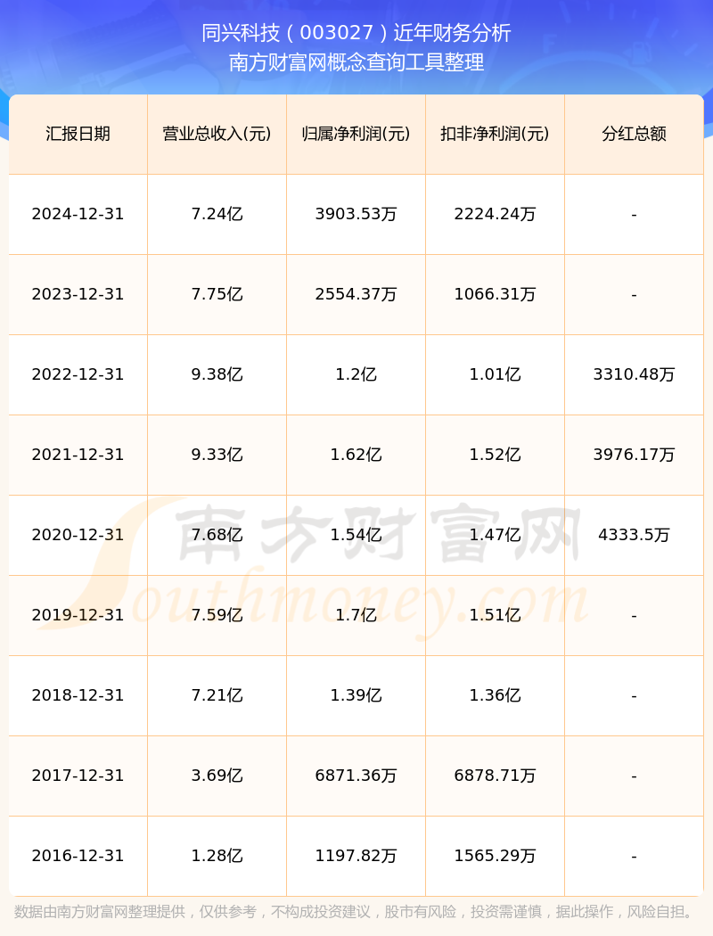 2024年同興科技總營收7.24億,同比增長-6.56%;凈利潤3903.53萬,同比增長52.82%;銷售毛利率20.02%。