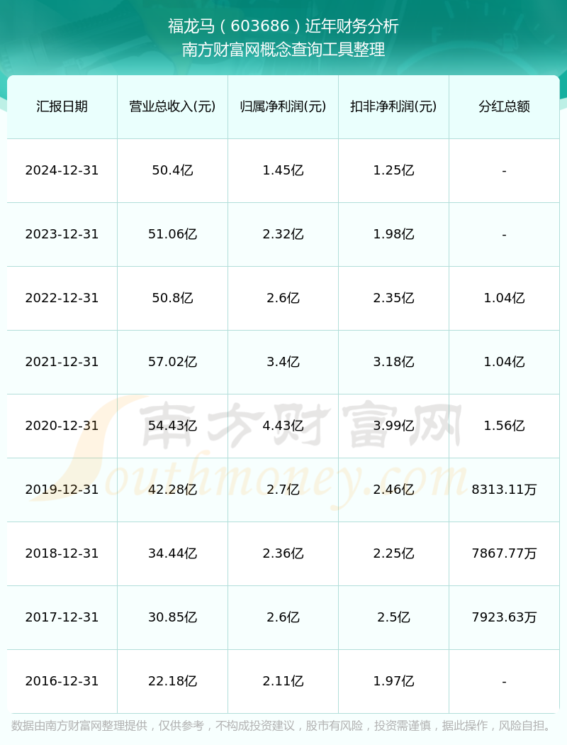 2024年報(bào)顯示,福龍馬實(shí)現(xiàn)營(yíng)收50.4億,同比增長(zhǎng)-1.3%;凈利潤(rùn)1.45億,同比增長(zhǎng)-37.43%;毛利率21.57%。