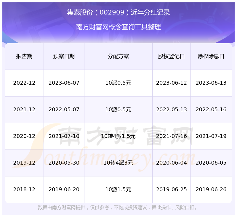 集泰股份最新一次公布的分紅方案為10派0.5元。本次權益分派股權登記日為2023年6月12日,除權除息日為2023年6月13日,派息日為2023年6月13日。