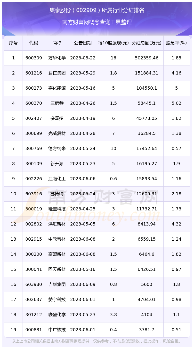 按照南方財富網(wǎng)趨勢選股系統(tǒng)統(tǒng)計,集泰股份所屬行業(yè)為化學原料行業(yè),化學原料行業(yè)分紅排名情況如下表:
