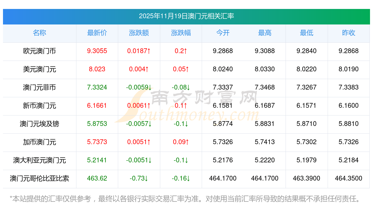 根據(jù)2025年11月19日匯率,澳門元兌換新幣匯率最新0.162300,今開0.1624,昨收0.1623,最高0.1625,最低0.1621。