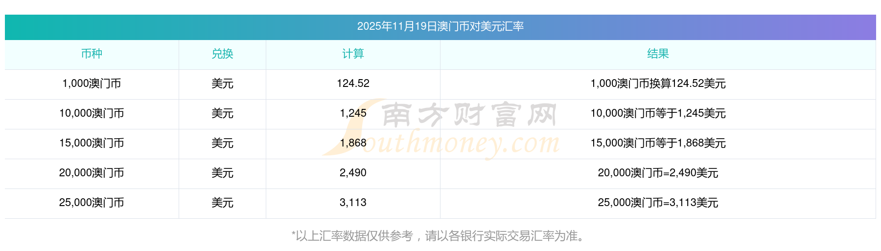 2025年11月19日匯率行情:39澳門幣對美元匯率多少