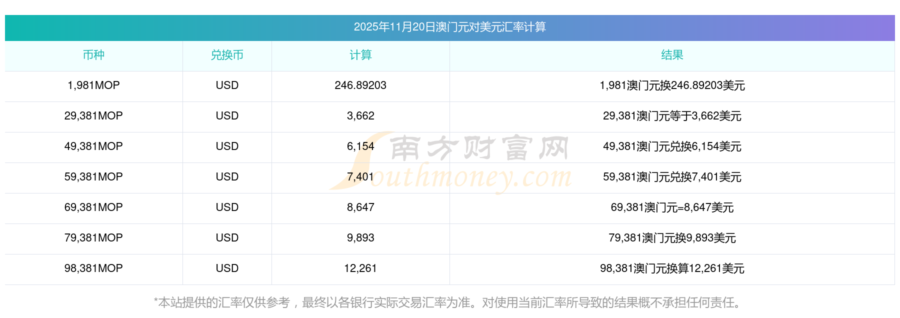 2025年11月20日匯率行情:18澳門元對美元匯率多少