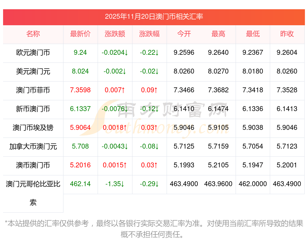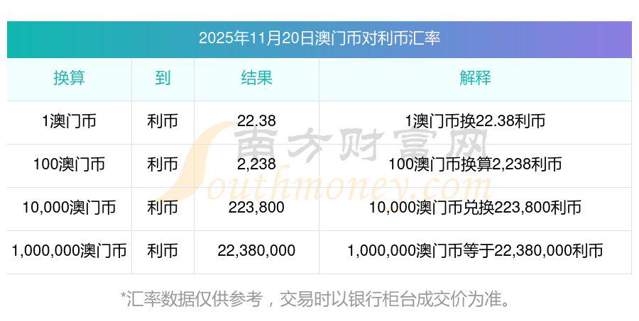 新匯率調(diào)整 今天11澳門幣兌換利幣匯率是多少? 2025-11-20