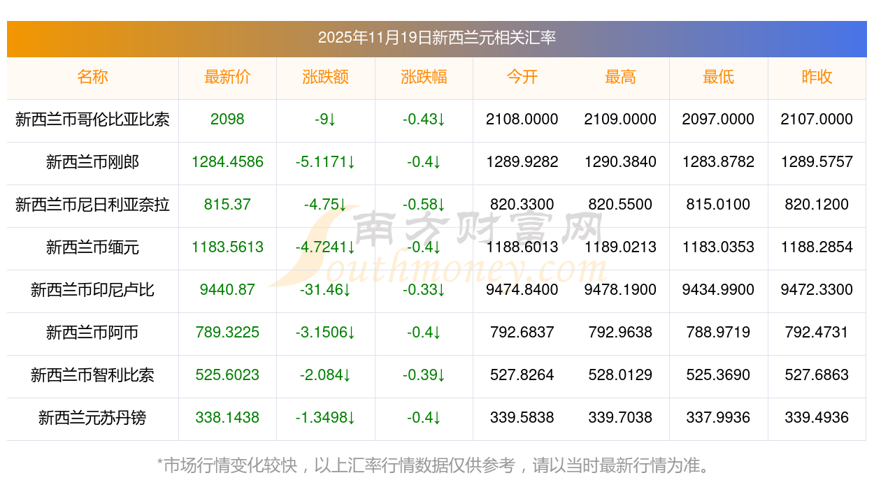 2025年11月19日新西蘭元相關(guān)匯率查詢