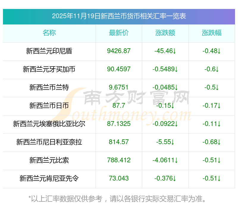 2025年11月19日新西蘭幣相關(guān)匯率查詢