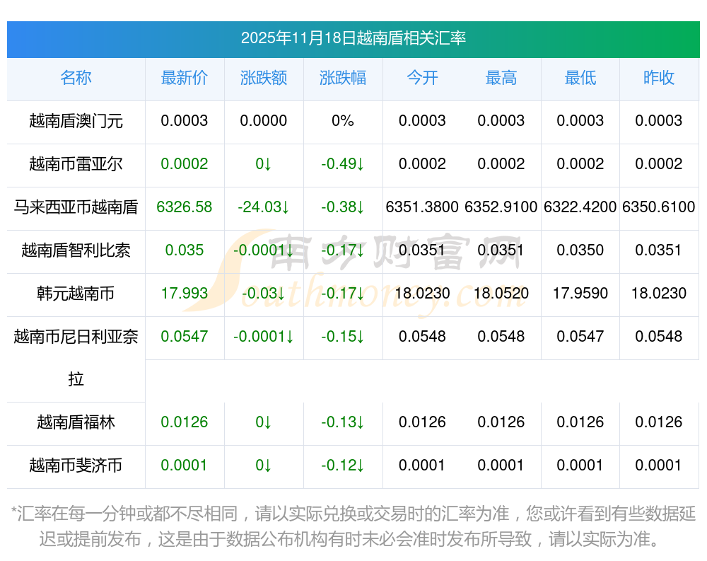 2025年11月18日越南盾兌換比索最新匯率:0.000700,今開:0.0007,昨收:0.0007,最高:0.0007,最低:0.0007。
