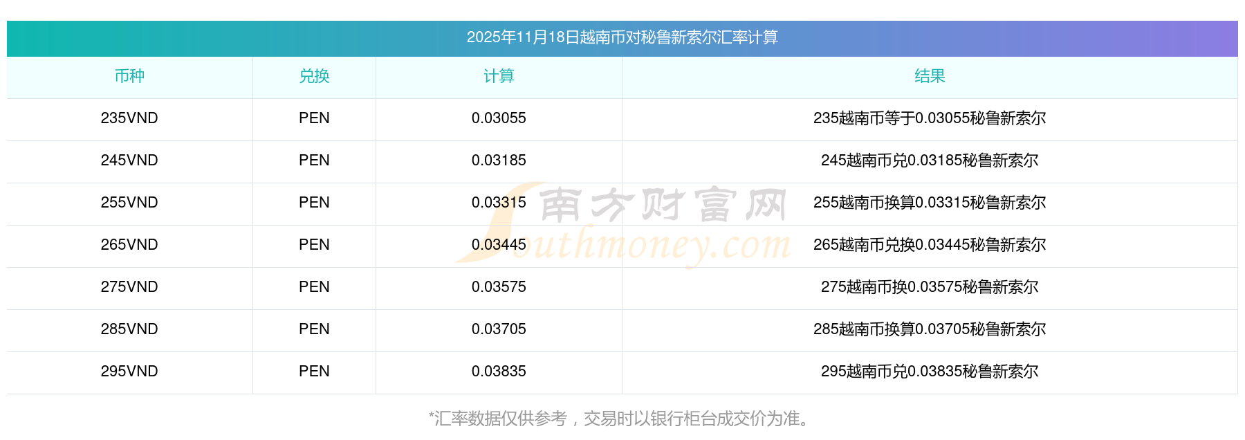南方財(cái)富網(wǎng)為您提供越南幣對(duì)秘魯新索爾匯率最新價(jià)格詳情。