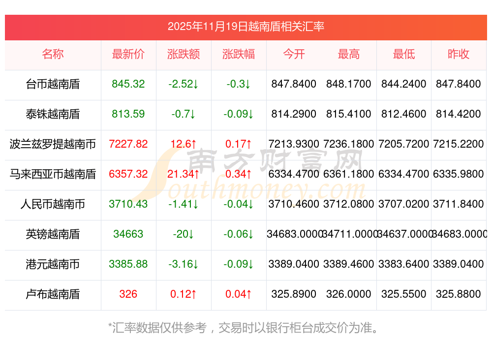 根據(jù)2025年11月19日匯率,越南盾兌換秘魯新索爾匯率最新價0.000128,今開價0.0001,昨收價0.0001,最高價0.0001,最低價0.0001。