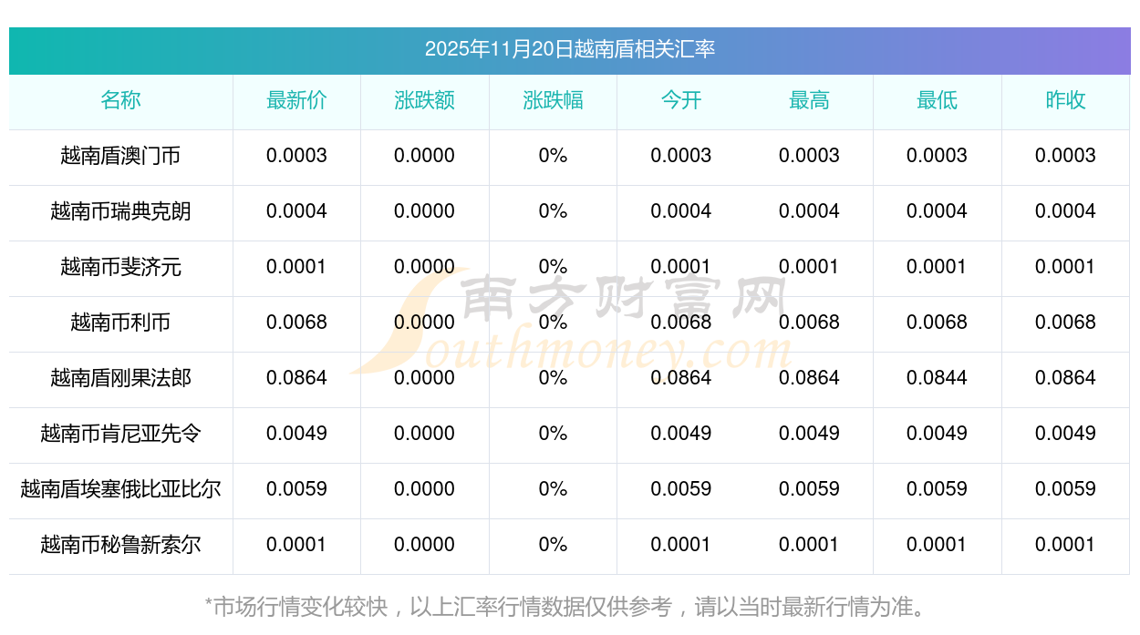 根據(jù)2025年11月20日匯率計(jì)算,VND兌換PLN匯率最新價(jià)0.000139,今開價(jià)0.0001,昨收價(jià)0.0001,最高價(jià)0.0001,最低價(jià)0.0001。