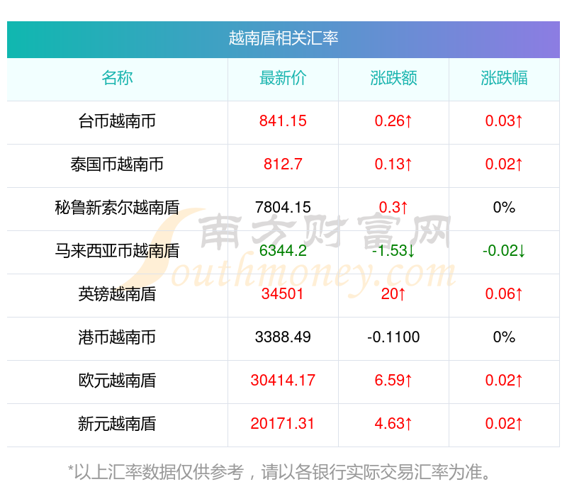 南方財(cái)富網(wǎng)為您提供越南盾對(duì)瑞郎匯率最新價(jià)格詳情。