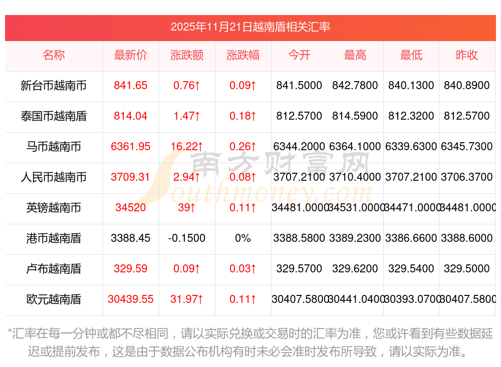根據(jù)2025年11月21日匯率,越南盾兌換挪幣匯率最新價0.000387,今開價0.0004,昨收價0.0004,最高價0.0004,最低價0.0004。