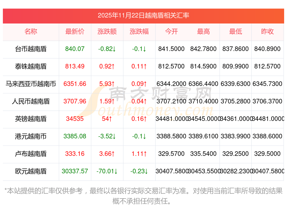 2025年11月22日最新消息,越南盾兌換尼日利亞奈拉最新匯率為0.055112,今開為0.0551,昨收為0.0551,最高為0.0553,最低為0.0550。