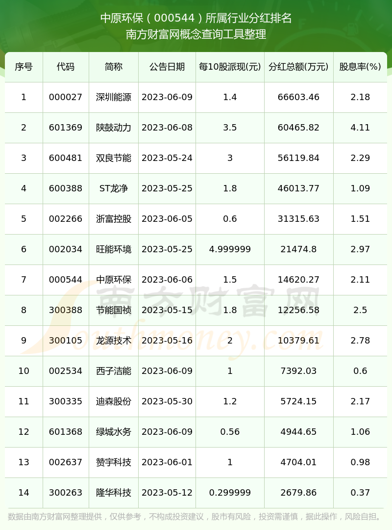 中原環(huán)保最新一次公布的分紅方案為10派1.5元。本次權(quán)益分派股權(quán)登記日為2023年6月12日,除權(quán)除息日為2023年6月13日,派息日為2023年6月13日。