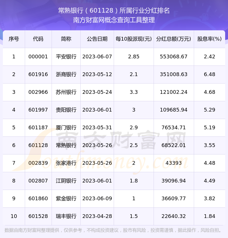 按照南方財富網(wǎng)趨勢選股系統(tǒng)統(tǒng)計,常熟銀行所屬行業(yè)為銀行行業(yè),銀行行業(yè)分紅排名情況如下表: