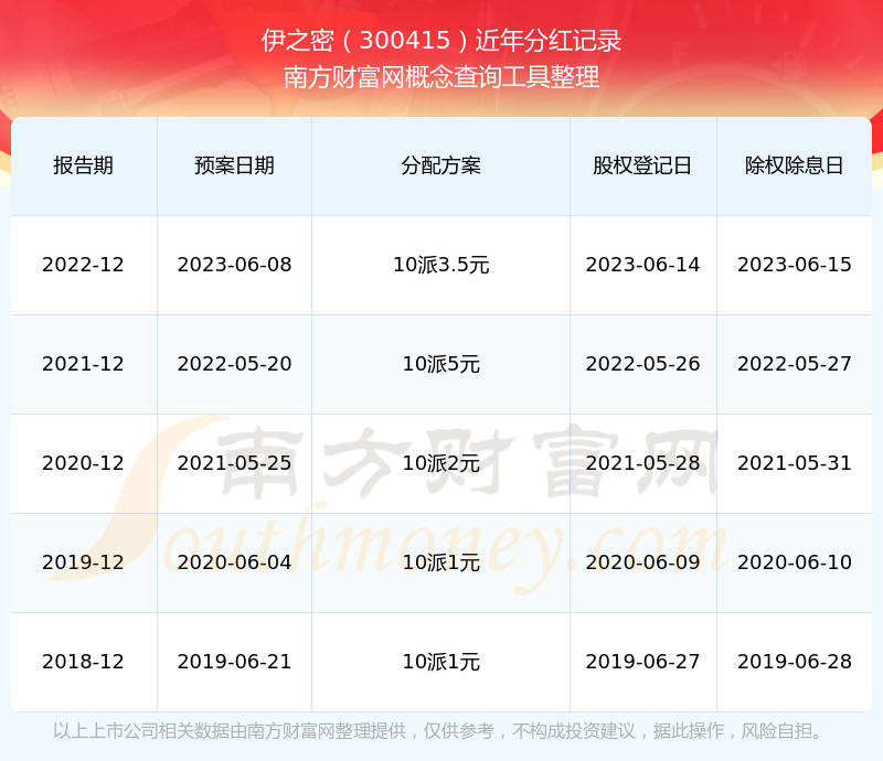 伊之密最新一次公布的分紅方案為10派3.5元。本次權(quán)益分派股權(quán)登記日為2023年6月14日,除權(quán)除息日為2023年6月15日,派息日為2023年6月15日。