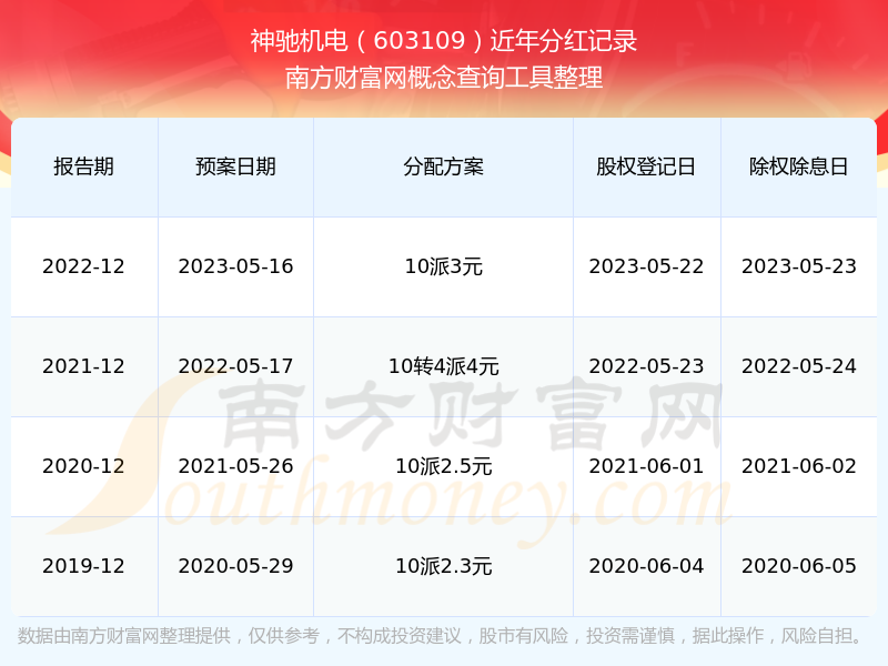 神馳機(jī)電最新一次公布的分紅方案為10派3元。本次權(quán)益分派股權(quán)登記日為2023年5月22日,除權(quán)除息日為2023年5月23日,派息日為2023年5月23日。