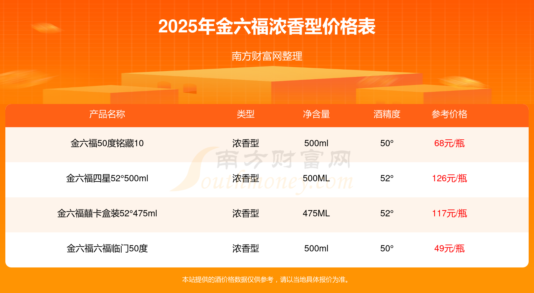 金六福四星52°500ml參考價(jià)126元/瓶、金六福囍卡盒裝52°475ml參考價(jià)117元/瓶、金六福50度銘藏10參考價(jià)68元/瓶、金六福六福臨門(mén)50度參考價(jià)49元/瓶。