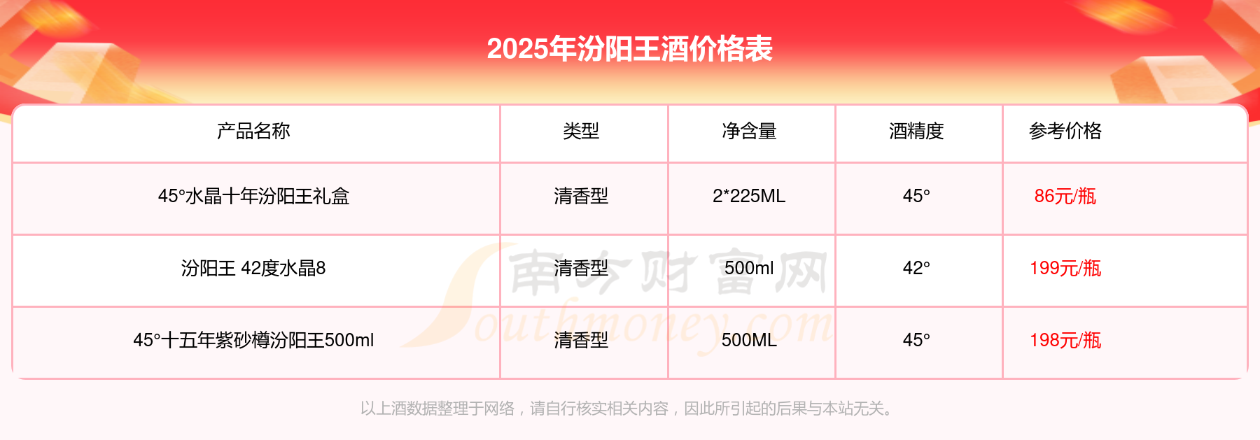汾陽王 42度水晶8參考價199元/瓶、45°十五年紫砂樽汾陽王500ml參考價198元/瓶、45°水晶十年汾陽王禮盒參考價86元/瓶。