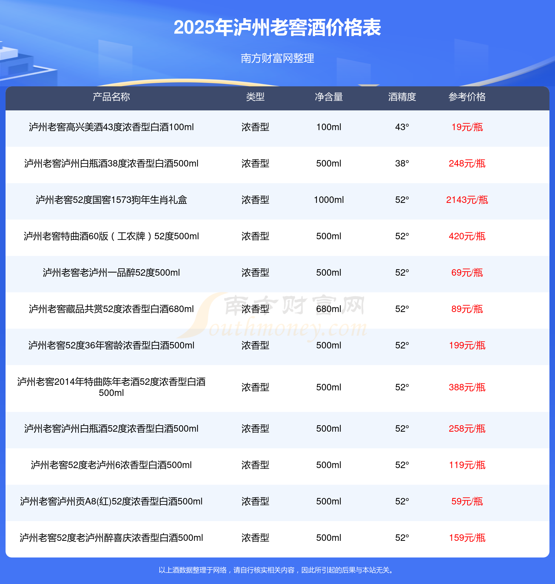 2025年,瀘州老窖國窖1573春釀鼠兆豐年E 55度、瀘州老窖國窖1573生命中的那壇酒55度014、瀘州老窖國窖1573春釀鼠兆豐年A 55度、瀘州老窖國窖1573生命中的那壇酒55度013濃香型白酒1000ml、瀘州老窖國窖1573生命中的那壇酒55度009 1000ml、瀘州老窖國窖1573中國品味52度濃香型白酒500ml、瀘州老窖國窖1573許燎源概念作品58度濃香型白酒1000ml等瀘州老窖酒參考價(jià)格如下:瀘州老窖國窖1573春釀鼠兆豐年E 55度參考價(jià)17999元、瀘州老窖國窖1573生命中的那壇酒55度014參考價(jià)9999元、瀘州老窖國窖1573春釀鼠兆豐年A 55度參考價(jià)5088元、瀘州老窖國窖1573生命中的那壇酒55度013濃香型白酒1000ml參考價(jià)4988元、瀘州老窖國窖1573生命中的那壇酒55度009 1000ml參考價(jià)4288元、瀘州老窖國窖1573中國品味52度濃香型白酒500ml參考價(jià)2888元、瀘州老窖國窖1573許燎源概念作品58度濃香型白酒1000ml參考價(jià)2680元。