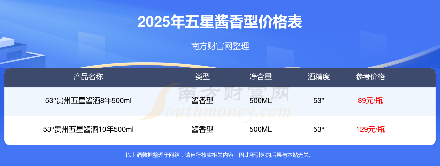 2025五星醬香型酒最新價(jià)格:53°貴州五星醬酒10年500ml參考價(jià)129元/瓶、53°貴州五星醬酒8年500ml參考價(jià)89元/瓶。