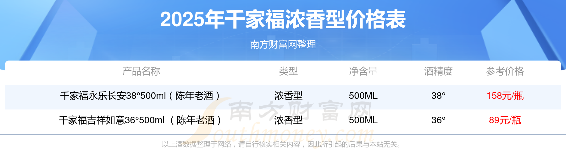 千家福濃香型酒最新價格2025:千家福永樂長安38°500ml(陳年老酒)參考價158元/瓶、千家福吉祥如意36°500ml (陳年老酒)參考價89元/瓶。