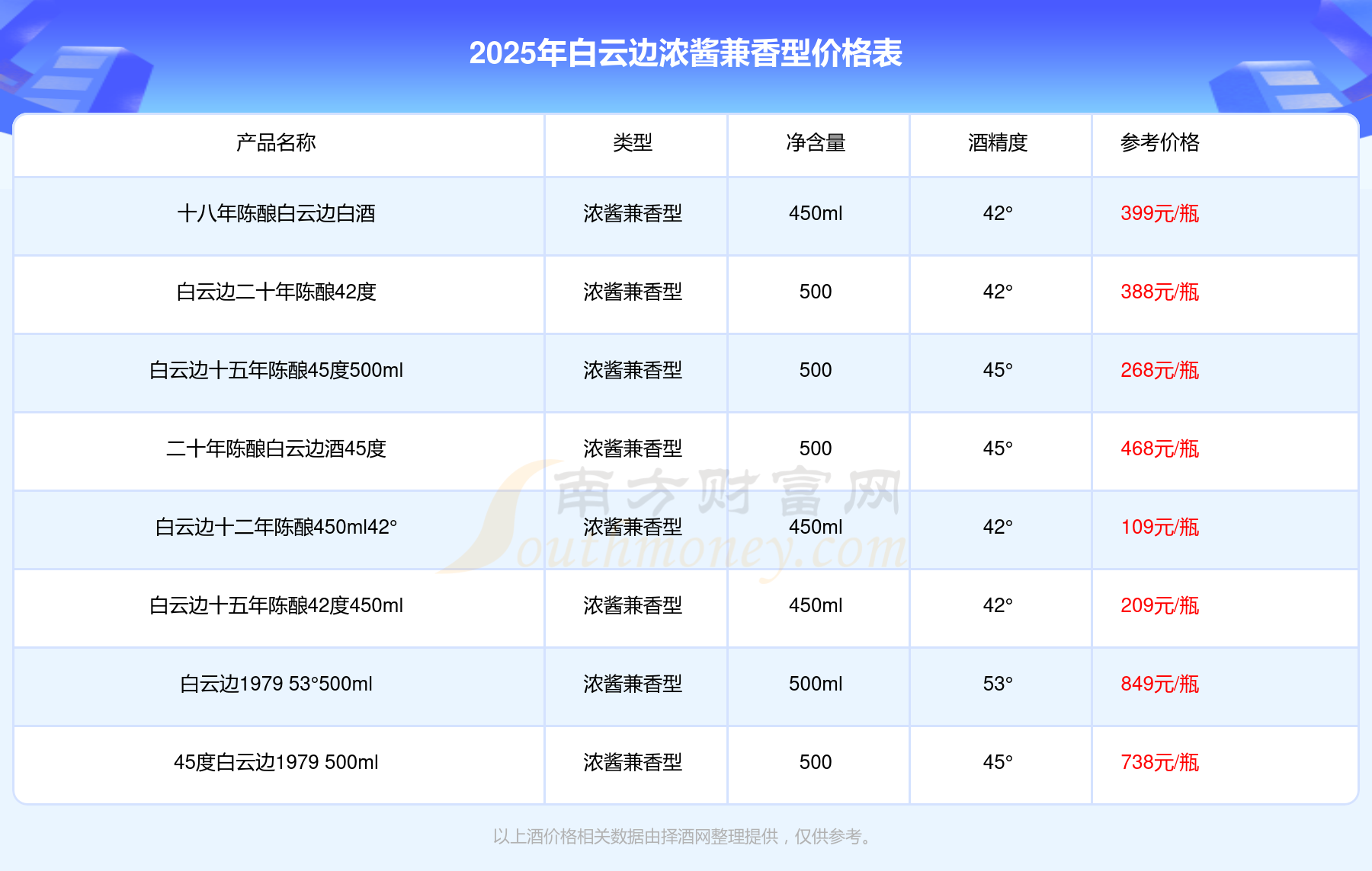 2025年,白云邊1979 53°500ml、45度白云邊1979 500ml、二十年陳釀白云邊酒45度、十八年陳釀白云邊白酒、白云邊二十年陳釀42度、白云邊十五年陳釀45度500ml、白云邊十五年陳釀42度450ml等白云邊濃醬兼香型酒價格如下: