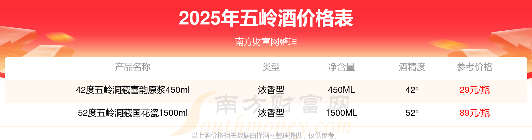 2025年,52度五嶺洞藏國花瓷1500ml、42度五嶺洞藏喜韻原漿450ml等五嶺酒價格如下: