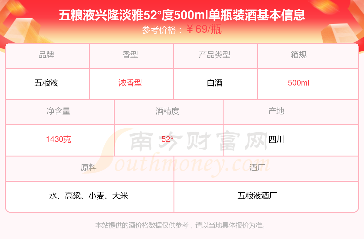 五糧液興隆淡雅52°度500ml單瓶裝基本信息