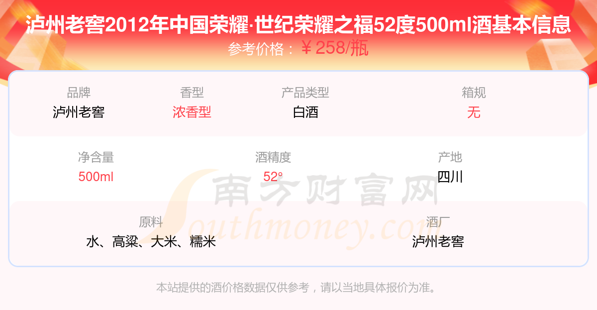 瀘州老窖2012年中國(guó)榮耀·世紀(jì)榮耀之福52度500ml基本信息