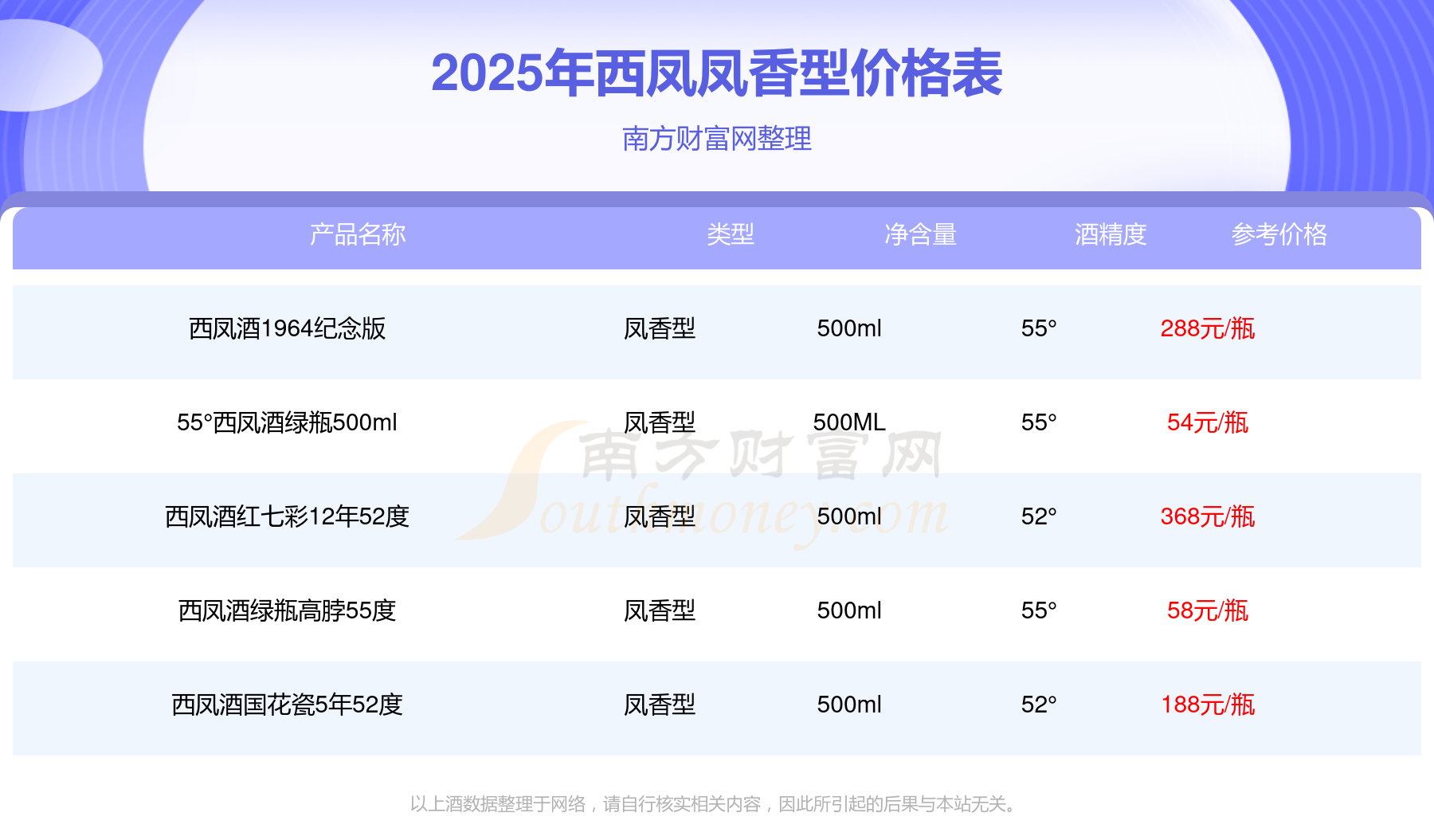 2025年,西鳳鳳香型酒價格最高的是西鳳酒紅七彩12年52度,參考價368元,最低的是55°西鳳酒綠瓶500ml,參考價54元,價格高低差為314元。