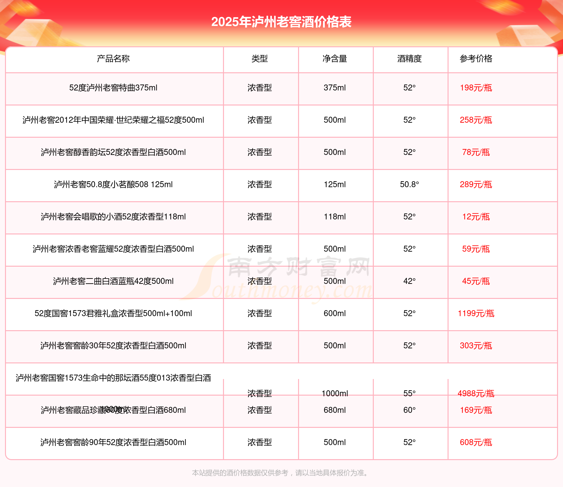 瀘州老窖國(guó)窖1573春釀鼠兆豐年E 55度參考價(jià)17999元/瓶、瀘州老窖國(guó)窖1573生命中的那壇酒55度014參考價(jià)9999元/瓶、瀘州老窖國(guó)窖1573春釀鼠兆豐年A 55度參考價(jià)5088元/瓶、瀘州老窖國(guó)窖1573生命中的那壇酒55度013濃香型白酒1000ml參考價(jià)4988元/瓶、瀘州老窖國(guó)窖1573生命中的那壇酒55度009 1000ml參考價(jià)4288元/瓶、瀘州老窖國(guó)窖1573中國(guó)品味52度濃香型白酒500ml參考價(jià)2888元/瓶。