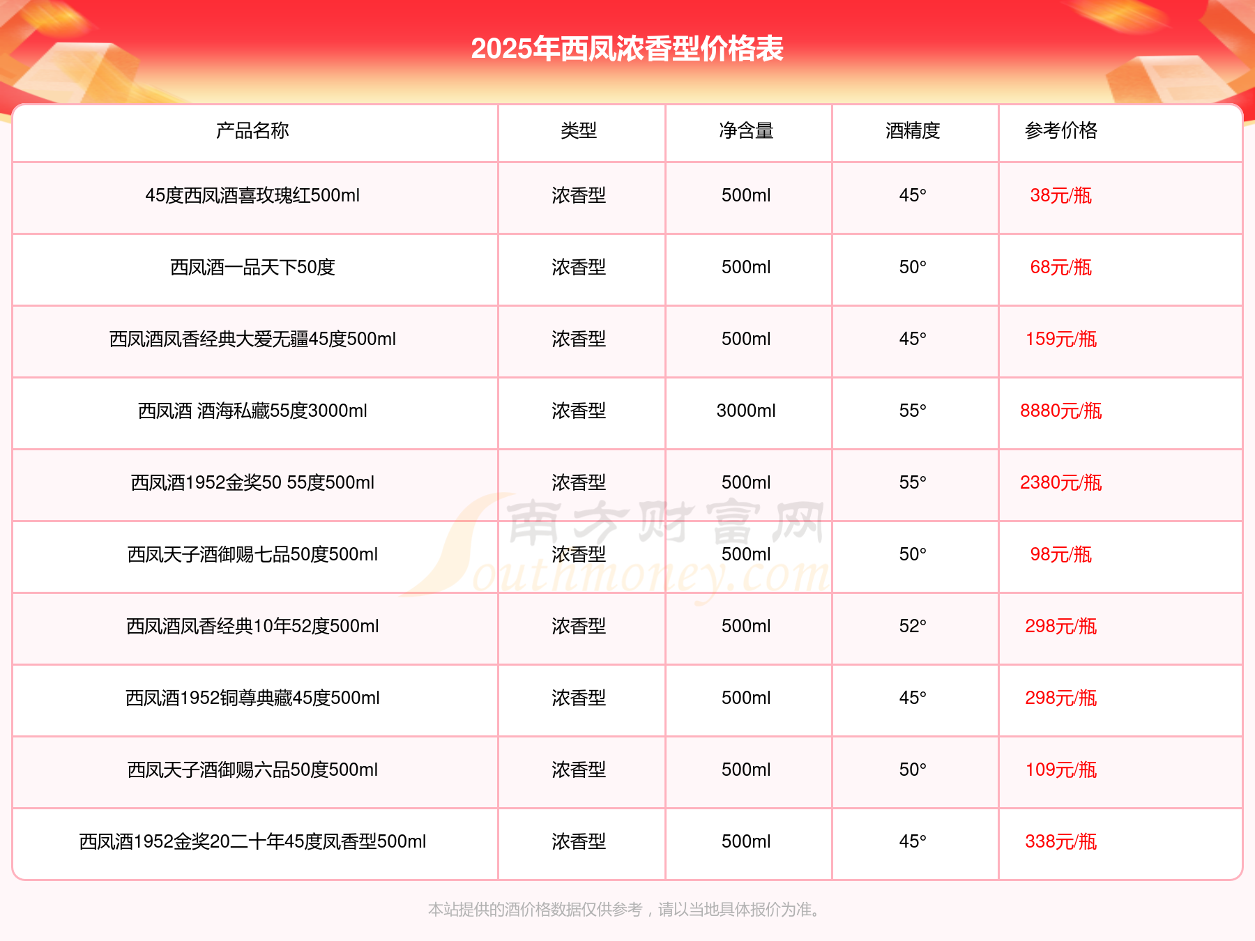 西鳳濃香型酒最新價格2025:西鳳酒 酒海私藏55度3000ml參考價8880元/瓶、西鳳酒1952金獎50 55度500ml參考價2380元/瓶、西鳳酒2013年產(chǎn)老酒鳳香經(jīng)典30年52度500ml參考價1280元/瓶、西鳳酒1952金獎30 55度500ml參考價898元/瓶、西鳳酒鳳香經(jīng)典20年52度500ml參考價768元/瓶、西鳳酒1952金獎30 45度500ml參考價658元/瓶、西鳳酒1956紀(jì)念版52度500ml參考價498元/瓶。