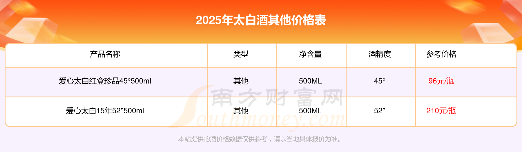 2025太白酒其他酒最新價(jià)格:愛(ài)心太白15年52°500ml參考價(jià)210元/瓶、愛(ài)心太白紅盒珍品45°500ml參考價(jià)96元/瓶。